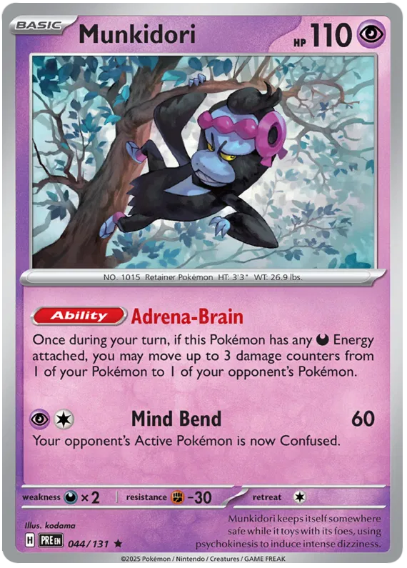 Munkidori from the Prismatic Evolutions set. This card features Mind Bend attack and Adrena-Brain ability.Card Release Date:2025.