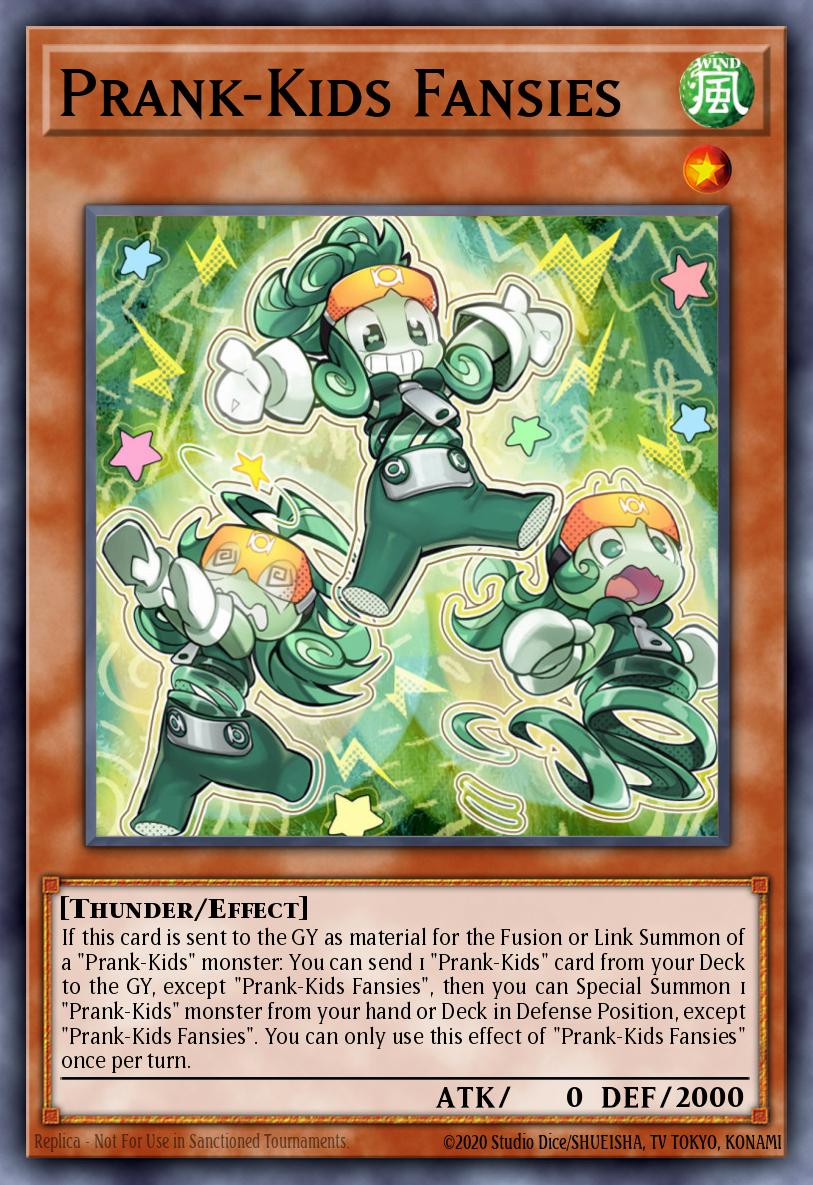 If this card is sent to the GY as material for the Fusion or Link Summon of a "Prank-Kids" monster: You can send 1 "Prank-Kids" card from your Deck to the GY, except "Prank-Kids Fansies", then you can Special Summon 1 "Prank-Kids" monster from your hand or Deck in Defense Position, except "Prank-Kids Fansies". You can only use this effect of "Prank-Kids Fansies" once per turn.