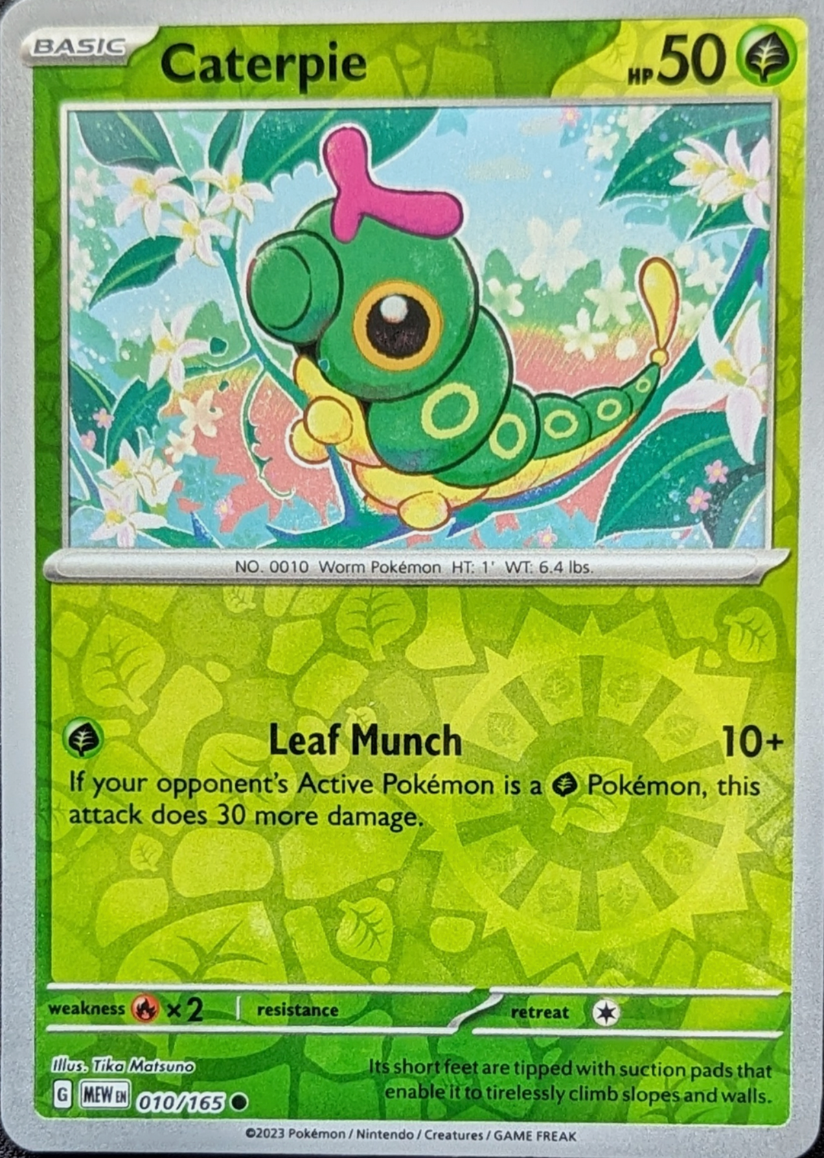 Discover Caterpie from the 151 set. This powerful card features Leaf Munch attack. A must-have for collectors and trainers, this card is from 2023.
