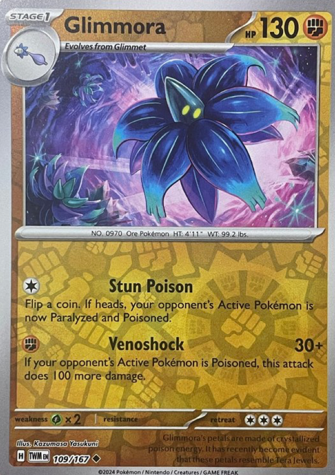 Discover Glimmora from the Twilight Masquerade set. This powerful card features Stun Poison attack. A must-have for collectors and trainers, this card is from 2024.