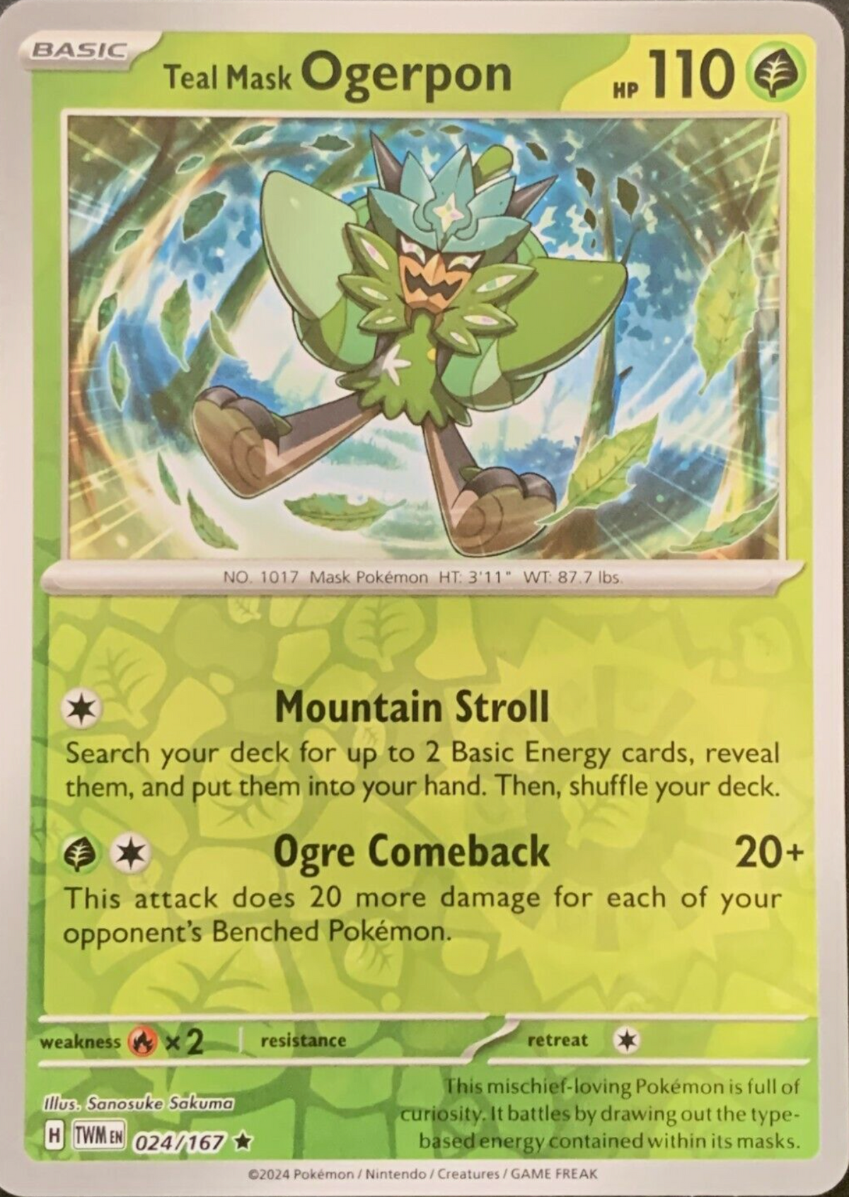 Discover Teal Mask Ogerpon from the Twilight Masquerade set. This powerful card features Mountain Stroll attack. A must-have for collectors and trainers, this card is from 2024.
