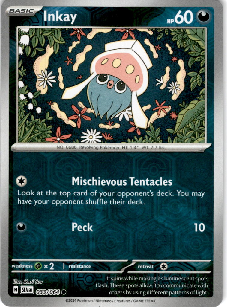 Inkay from the Shrouded Fable set. This card features Mischievous Tentacles attack.Card Release Date:2024.