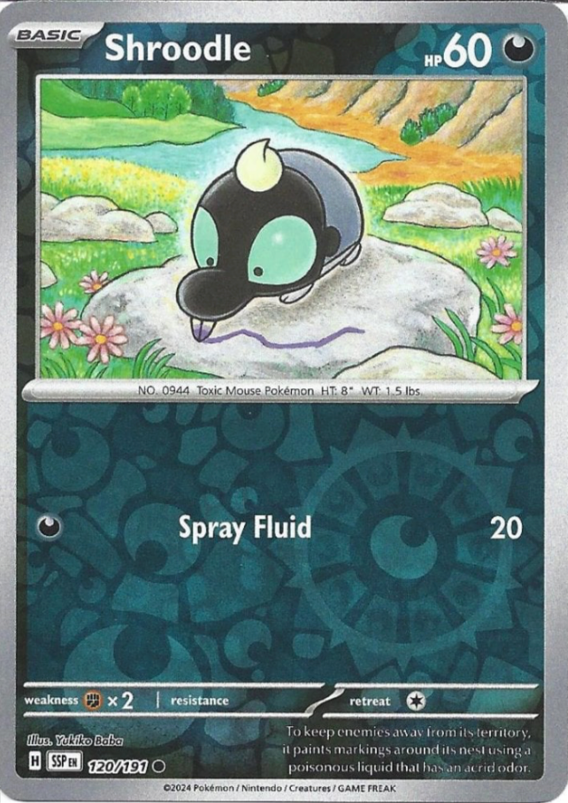 Shroodle from the Surging Sparks set. This card features Spray Fluid attack.Card Release Date:2024.