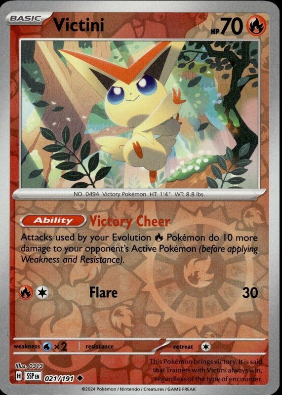 Victini from the Surging Sparks set. This card features Flare attack and Victory Cheer ability.Card Release Date:2024.