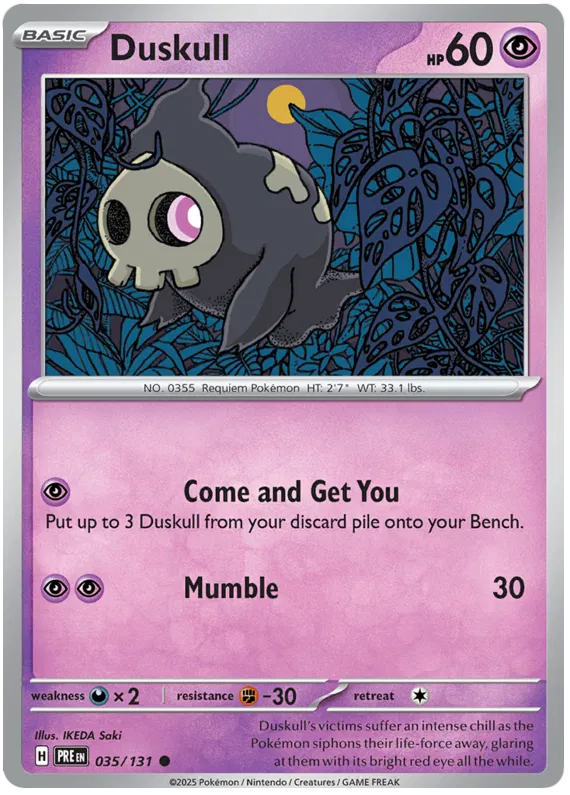 Duskull from the Prismatic Evolutions set. This card features Come and Get You attack.Card Release Date:2025.