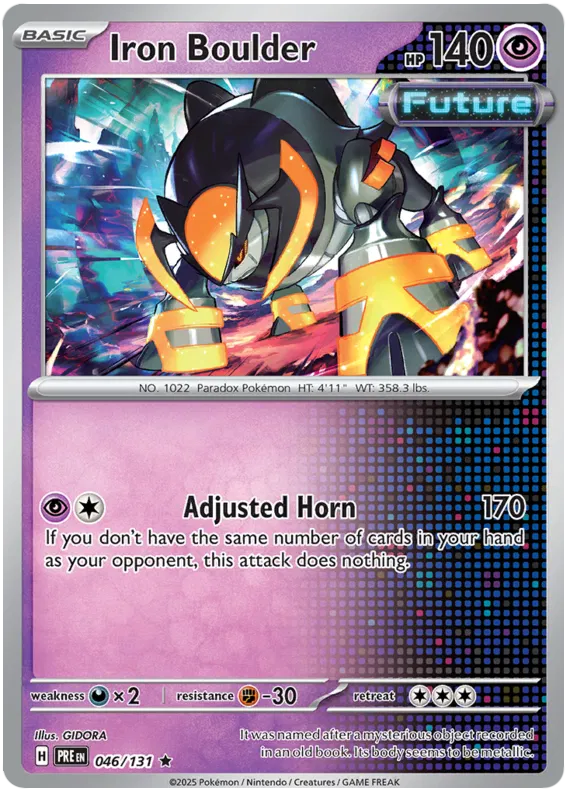 Iron Boulder from the Prismatic Evolutions set. This card features Adjusted Horn attack.Card Release Date:2025.