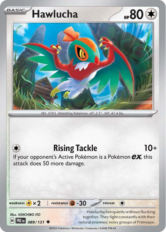 Hawlucha from the Prismatic Evolutions set. This card features Rising Tackle attack.Card Release Date:2025.