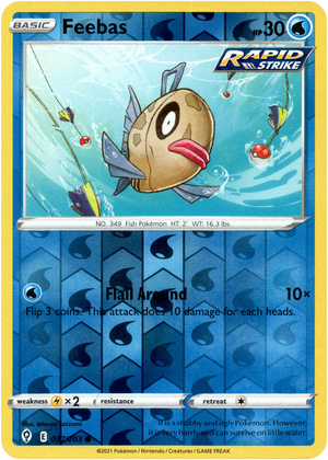 Discover Feebas from the Evolving Skies set. This powerful card features Flail Around attack. A must-have for collectors and trainers, this card is from 2021.